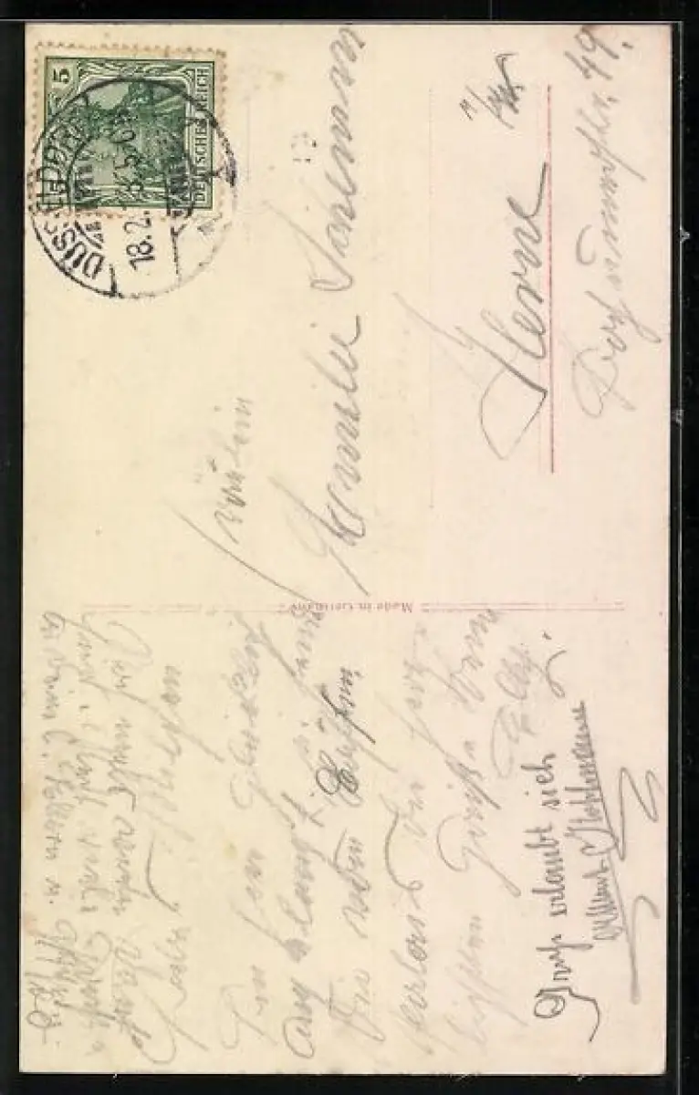 Personenbezogene Daten auf der Rückseite der Karte wurden durch blauen Textmarker unkenntlich gemacht. Die blauen Stellen sind auf die Vorderseite durchgeweicht und wirken sich negativ auf das Postkartenfoto aus