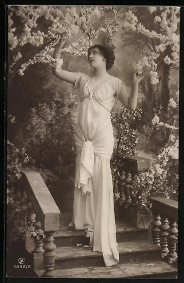 Foto-AK GL Co Nr. 3892/2: Junge Frau betrachtet die Frühlingsblüten über ihrem Kopf