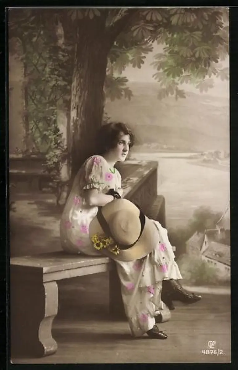 Foto-AK GL Co Nr. 4876/2: Junge Frau sitzt wartend auf einer Bank
