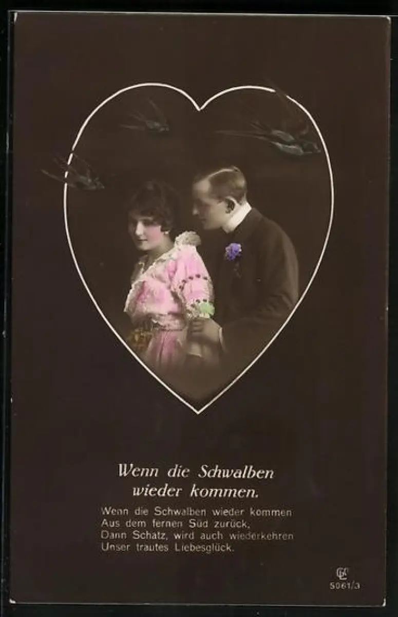 Foto-AK GL Co Nr. 5061/3: Verliebtes Paar im Herz-Rahmen mit Schwalben