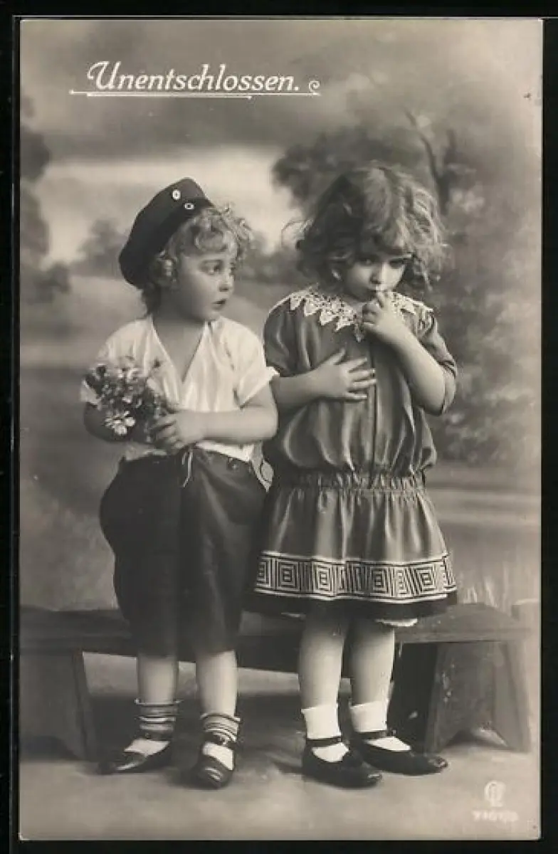 Foto-AK GL Co Nr. 7707/3: Junge blickt seine kleine Freundin fragend an, Unentschlossen