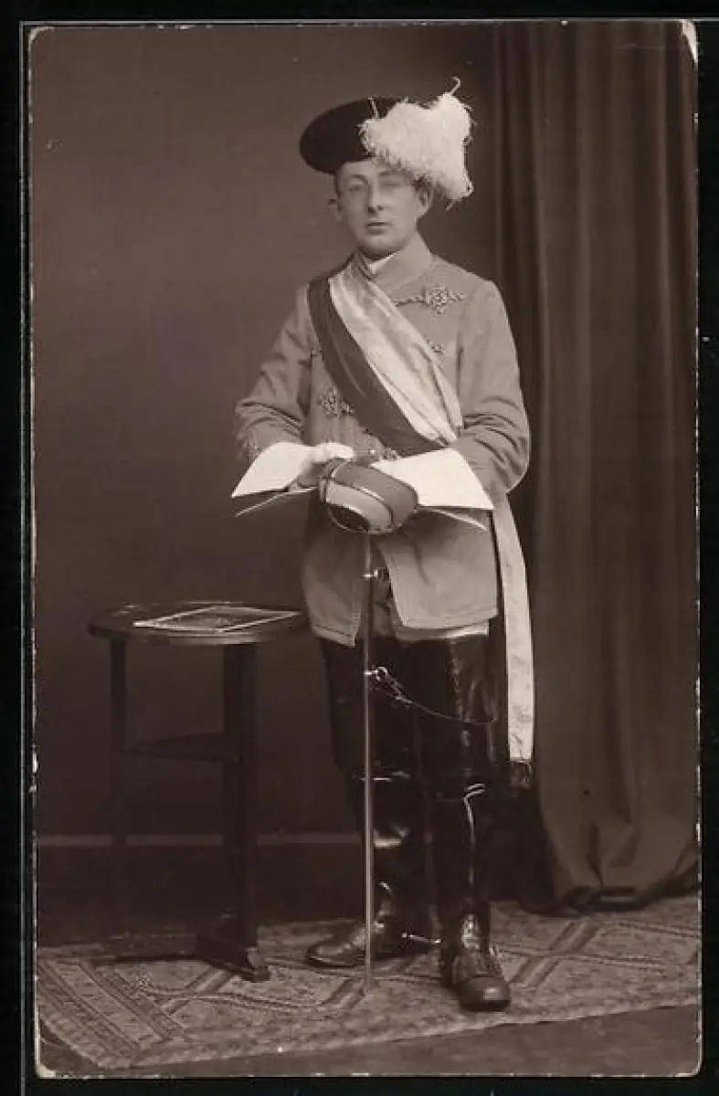 Foto-AK Ganzportrait Student mit Schärpe und Schläger, studentische Szene