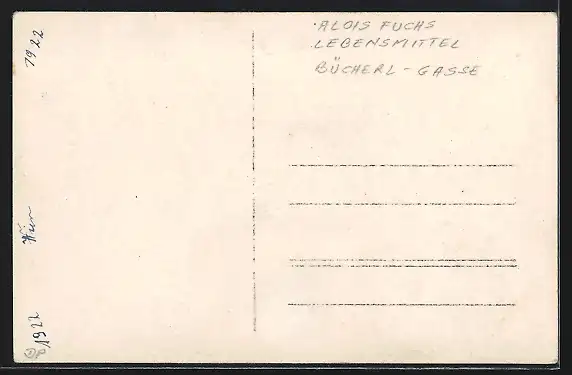 Foto-AK Gemischtwaren Alois Fuchs, Emailleschild-Reklame für Kunerol, Imperial Feigenkaffee, Kronenbrot
