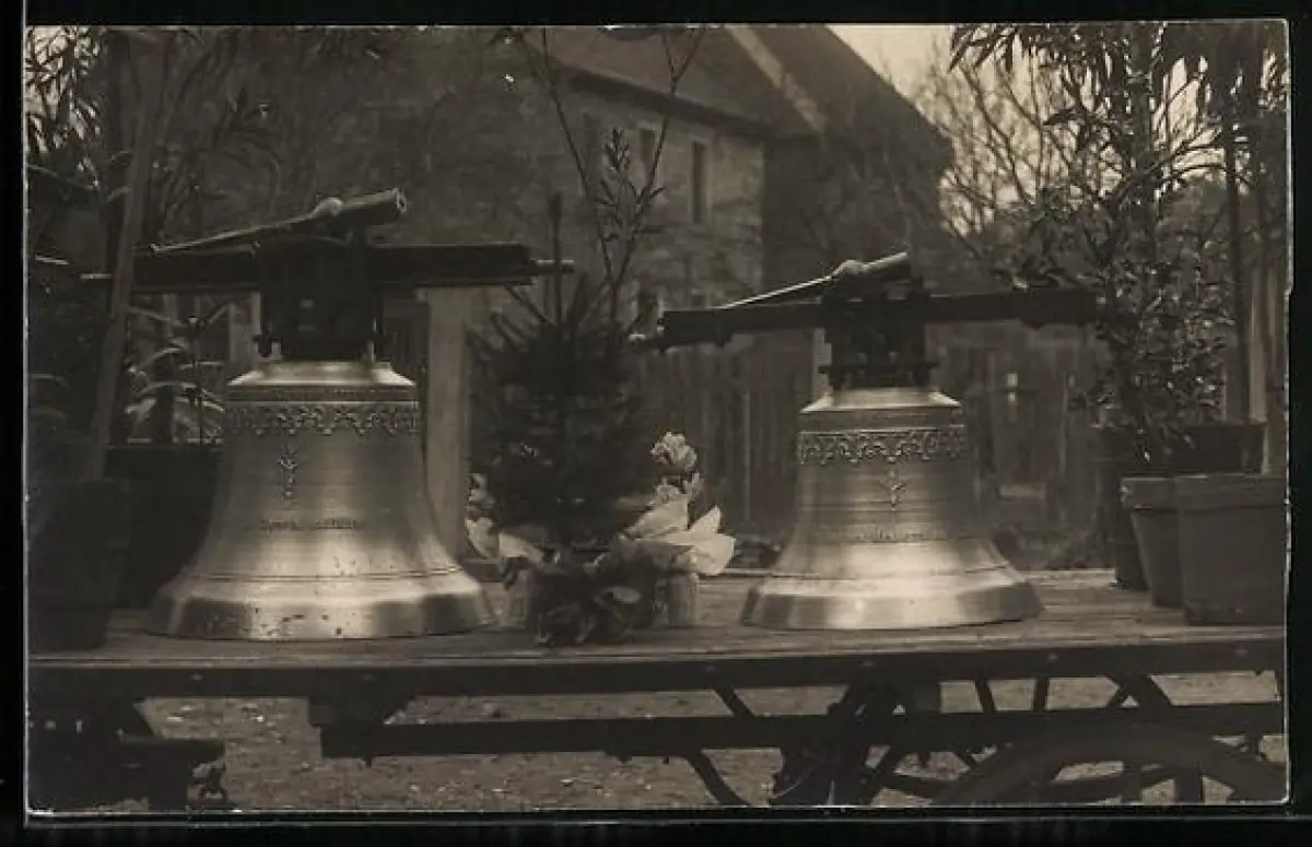 Foto-AK Giessen, Glocken mit Prägungen Ehre sei Gott in der Höhe und Friede den Menschen auf Erden