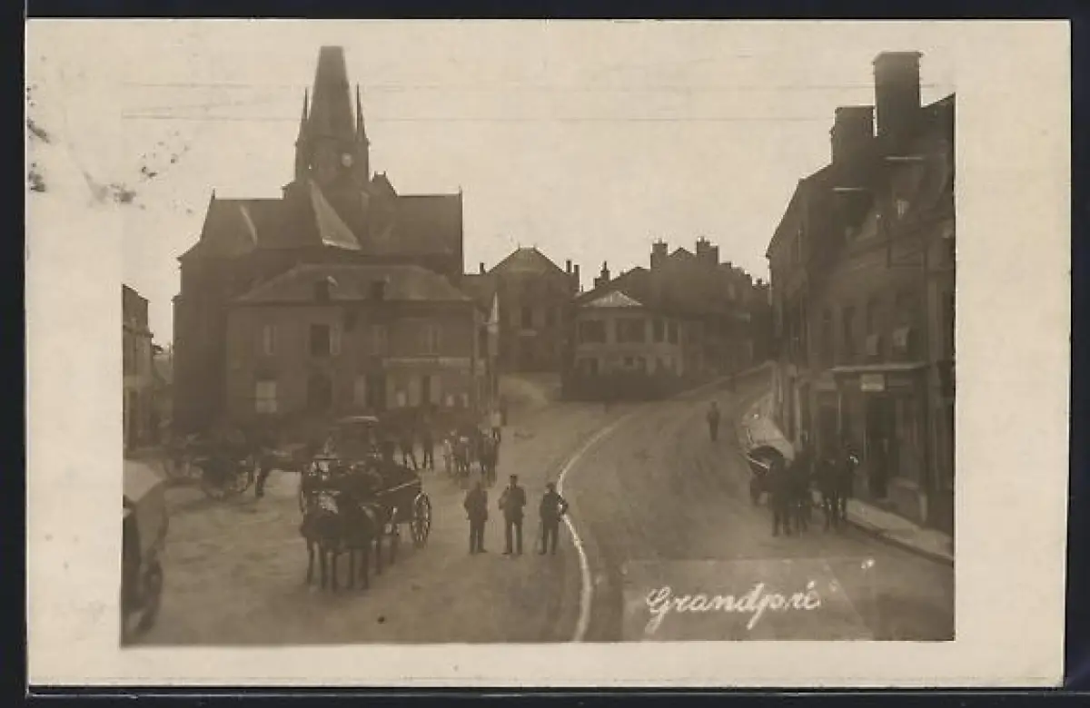 Foto-AK Grandpré, Strassenpartie mit dt. Soldaten, Pferdegespanne