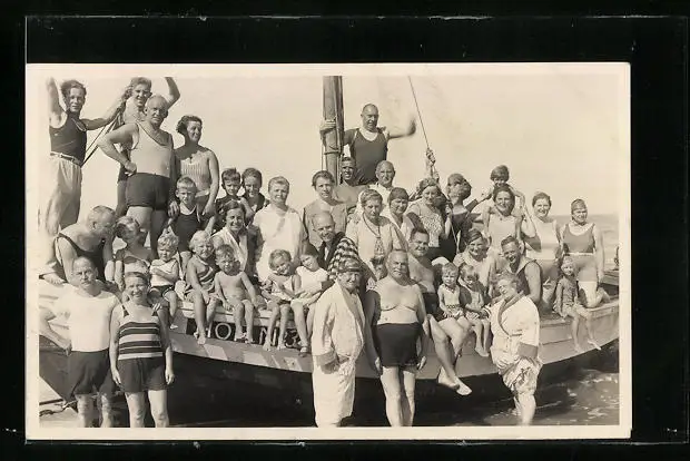 Foto-AK Grosse Gruppe in Badebekleidung auf einem Segelboot