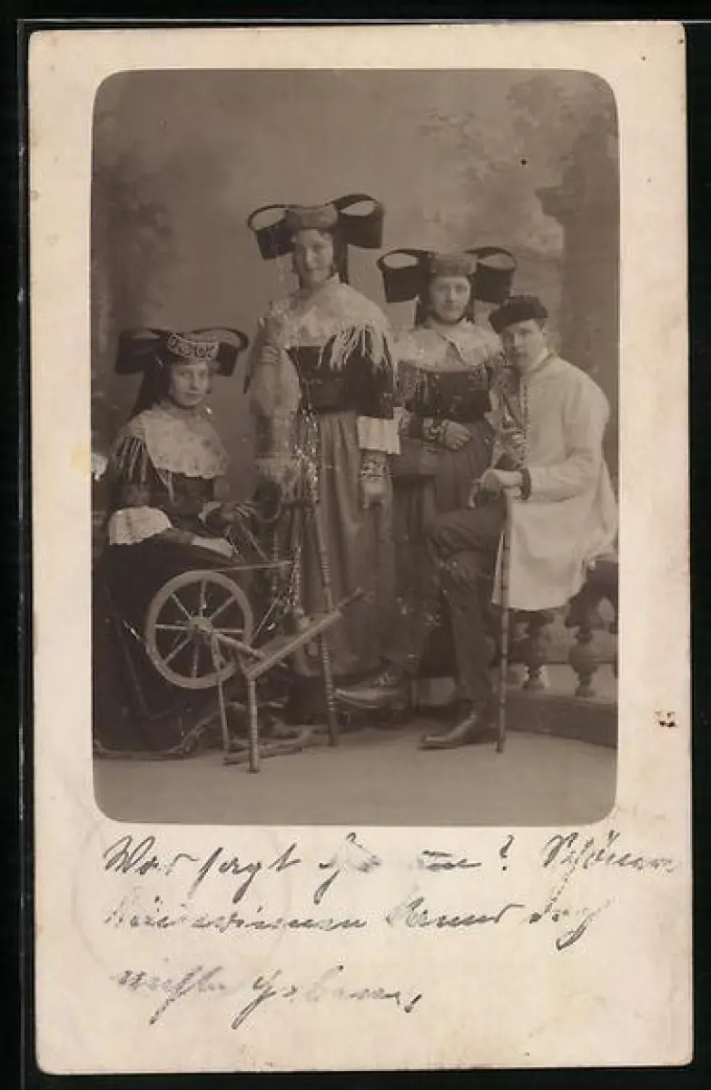 Foto-AK Gruppe in Trachten mit einem Spinnrad