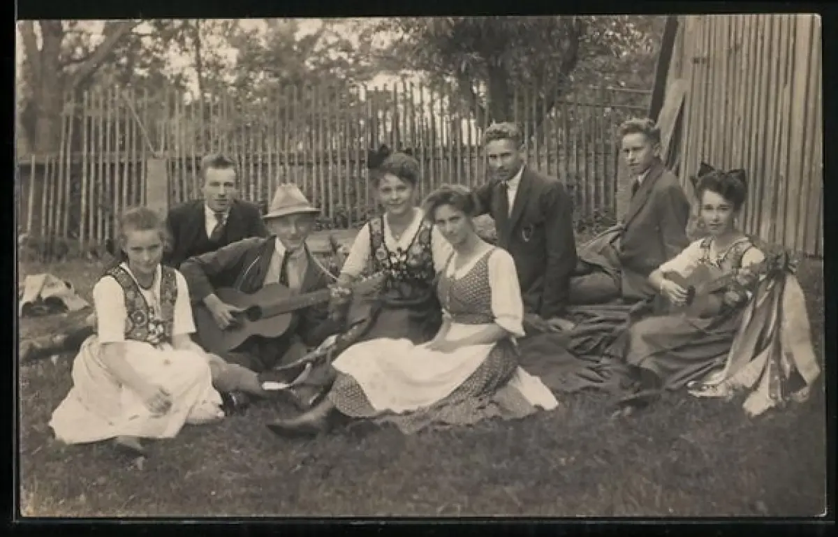 Foto-AK Gruppe sitzt auf einer Wiese mit Gitarre