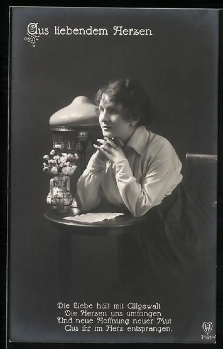 Foto-AK HB Nr. 7151: Junge Frau sitzt mit einem Brief an einem Tisch