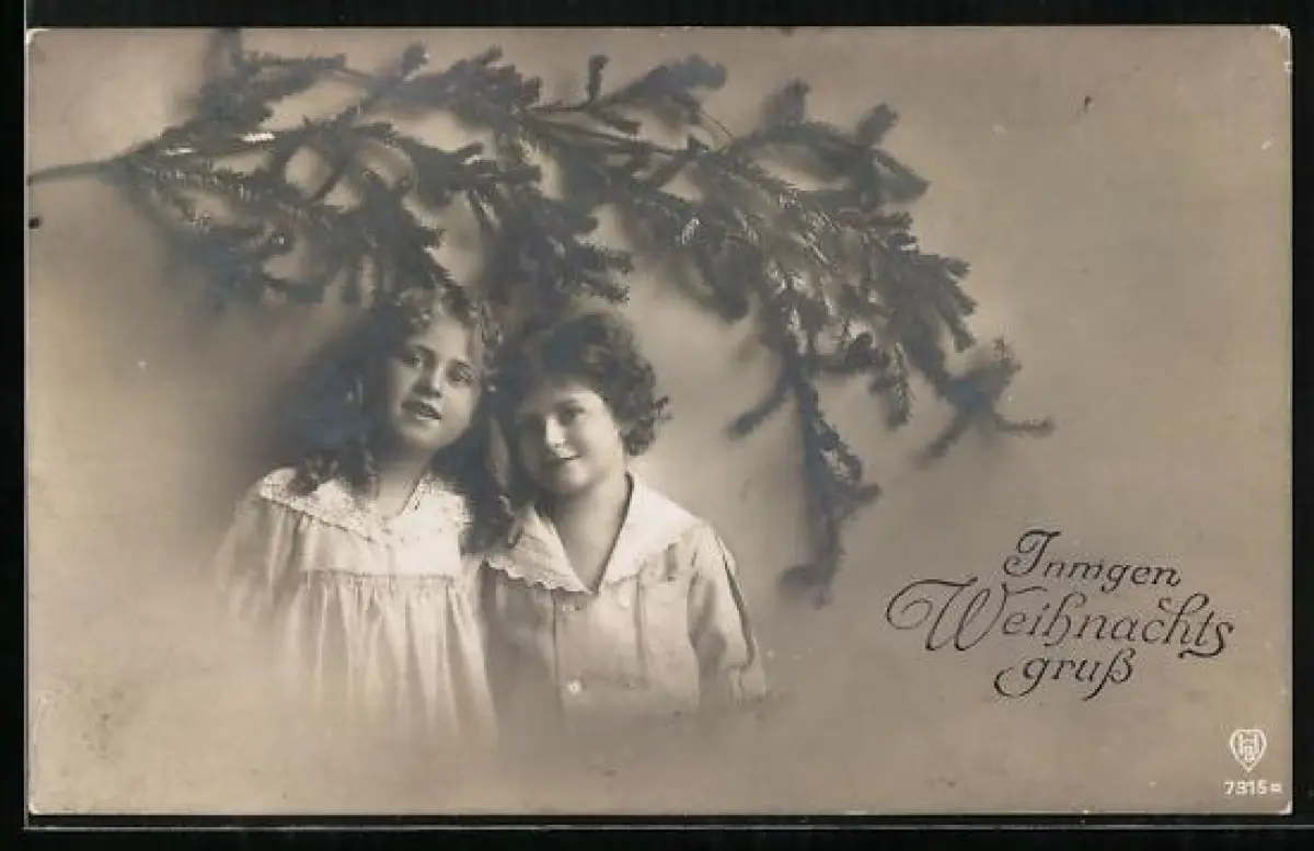 Foto-AK HB Nr. 7315: Zwei kleine Kinder unter einem Tannenzweig