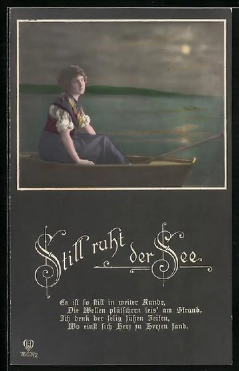 Foto-AK HB Nr. 7663/2: Dame sitzt im Mondschein in einem Ruderboot, Still ruht der See