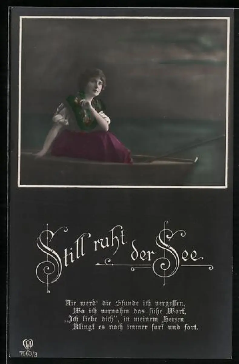 Foto-AK HB Nr. 7663/3: Dame in einem Ruderboot blickt in die Ferne, Still ruht der See