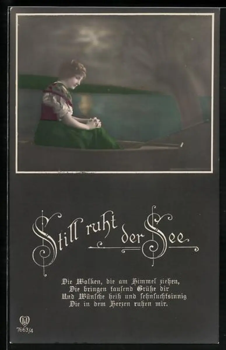 Foto-AK HB Nr. 7663/4: Dame sitzt einsame in einem Ruderboot, Still ruht der See