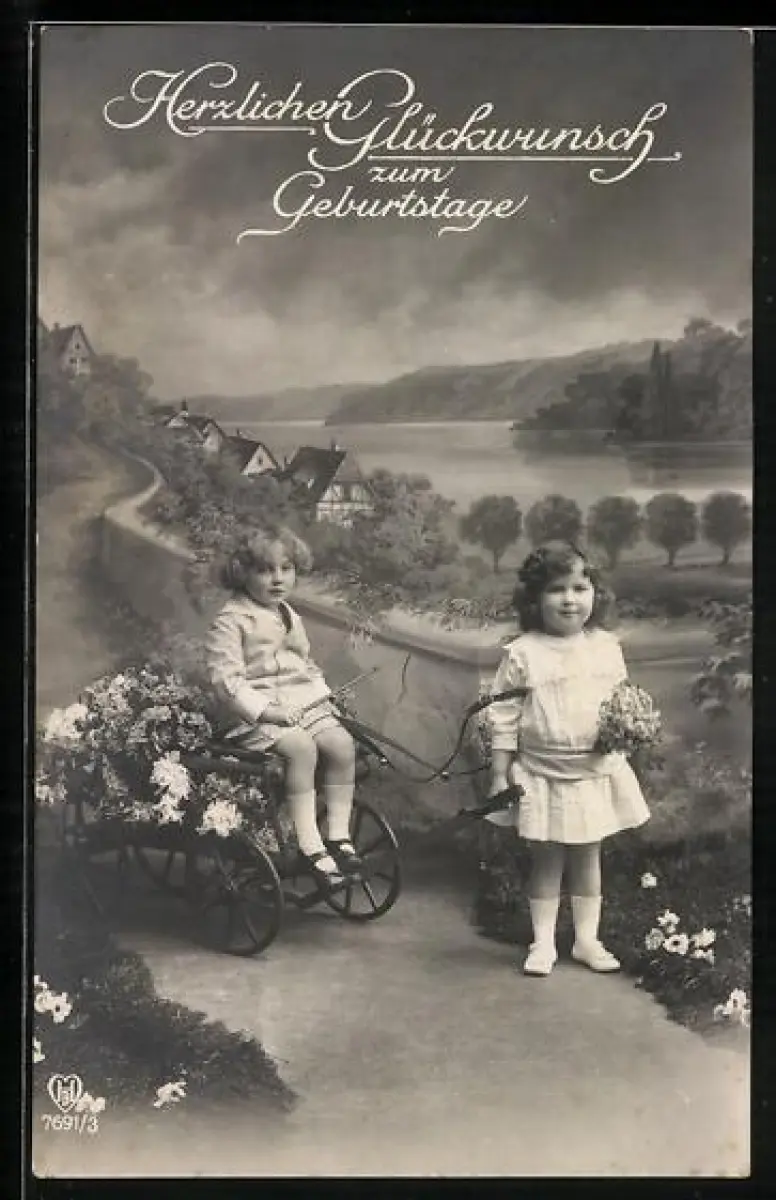 Foto-AK HB Nr. 7691/3: Zwei Kleinkinder mit einem Karren voller Blumen