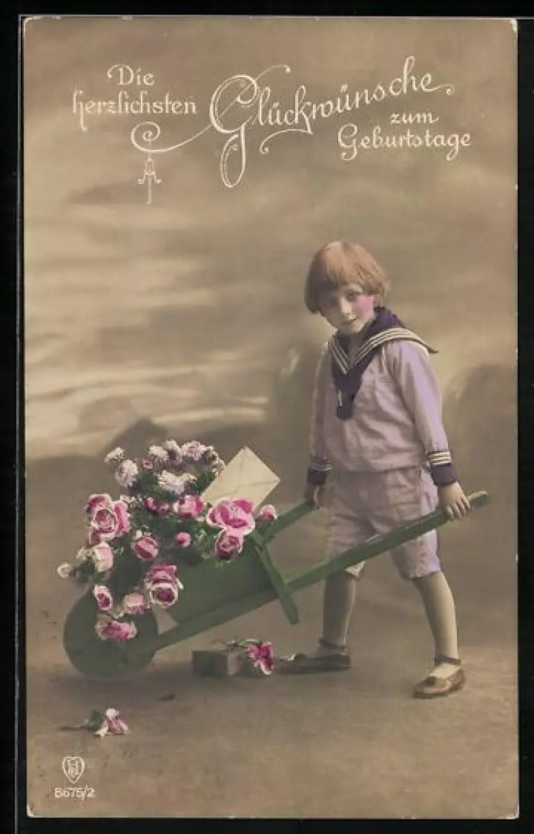 Foto-AK HB Nr. 8675/2: Kind in Matrosenanzug mit Karren voller Blumen