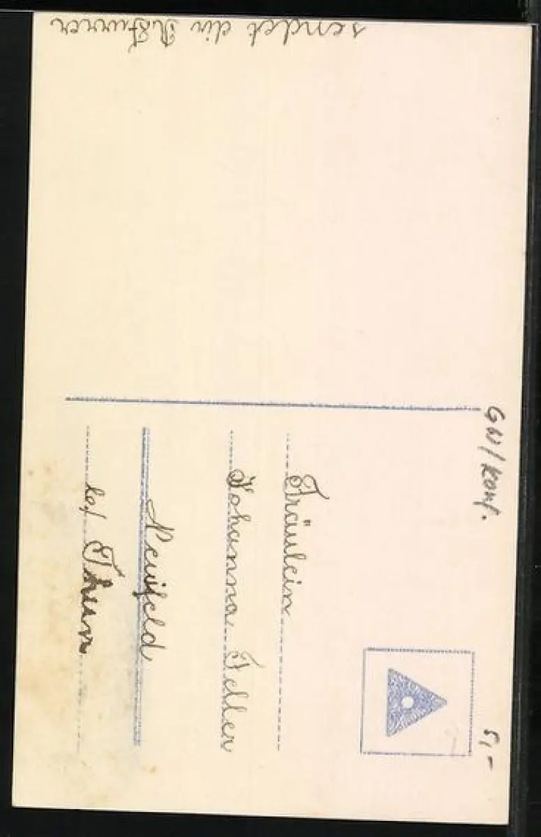 Personenbezogene Daten auf der Rückseite der Karte wurden durch blauen Textmarker unkenntlich gemacht. Die blauen Stellen sind auf die Vorderseite durchgeweicht und wirken sich negativ auf das Postkartenfoto aus