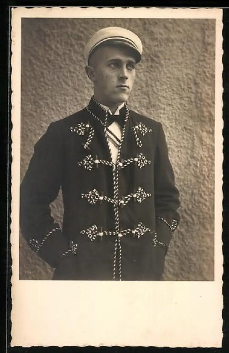 Foto-AK Halbportrait Student in Uniform mit Schirmmütze, studentische Szene