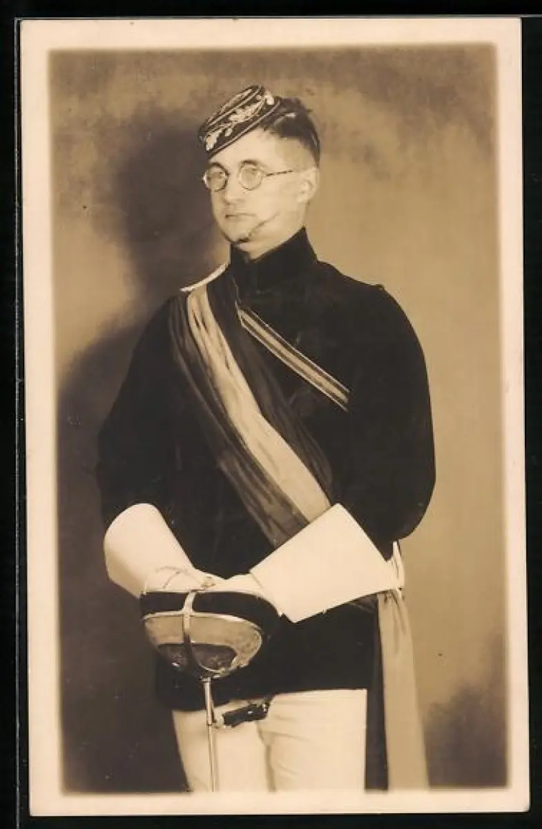 Foto-AK Halbportrait Student mit Schärpe, Tönnchen und Schläger, studentische Szene