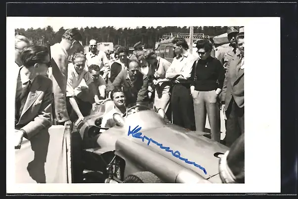 Foto-AK Hans Herrmann im Mercedes Benz und Crew beim Autorennen, mit Autograph