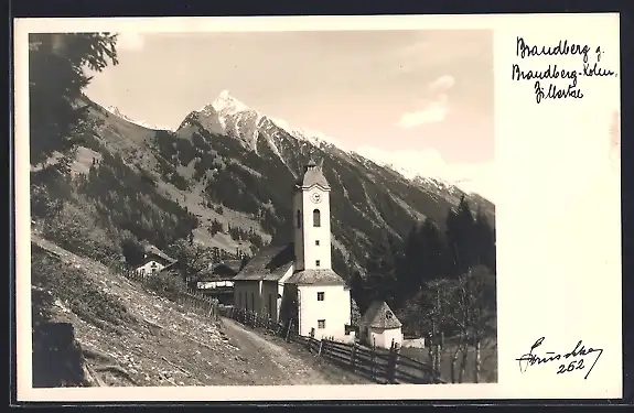 Foto-AK Hans Hruschka Nr. 252: Brandberg /Zillertal, Kirche gegen Brandberg-Kolm