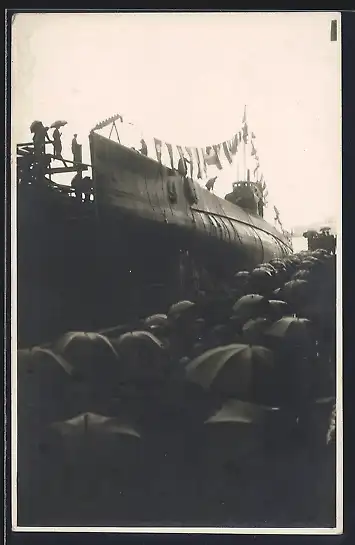 Foto-AK Italienisches U-Boot Delfino beim Stapellauf 1930