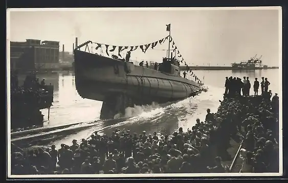 Foto-AK Italienisches U-Boot Delfino beim Stapellauf 1930