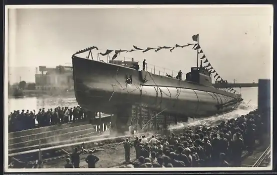 Foto-AK Italienisches U-Boot Delfino läuft vom Stapel 1930
