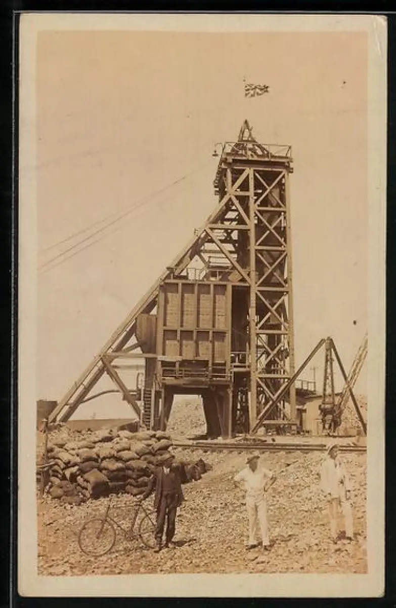 Foto-AK Johannesburg, Gold Mine, Headgear and Workers