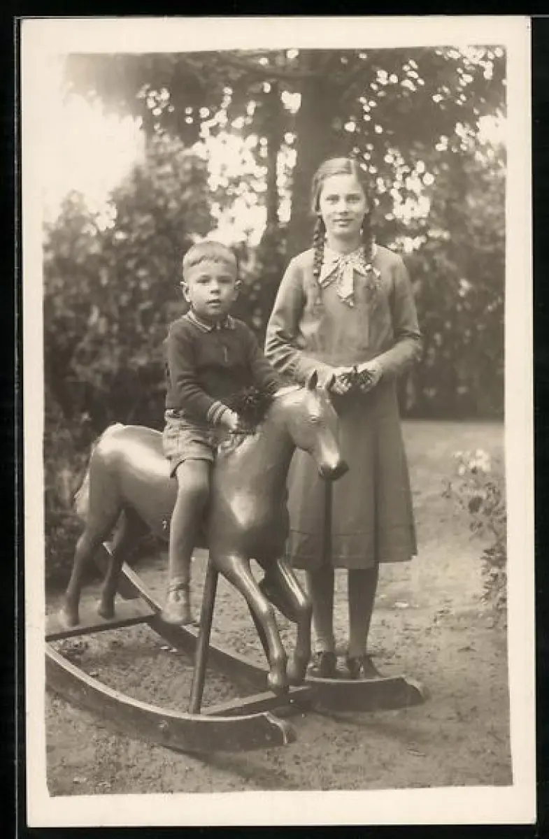 Foto-AK Junge auf Schaukelpferd, daneben Mädchen