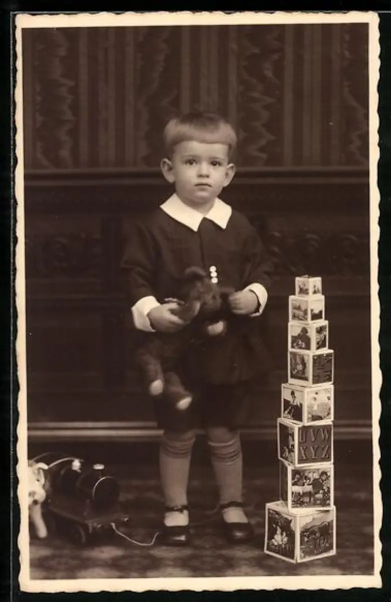 Foto-AK Junge mit Teddybär und einem Turm aus Klötzen