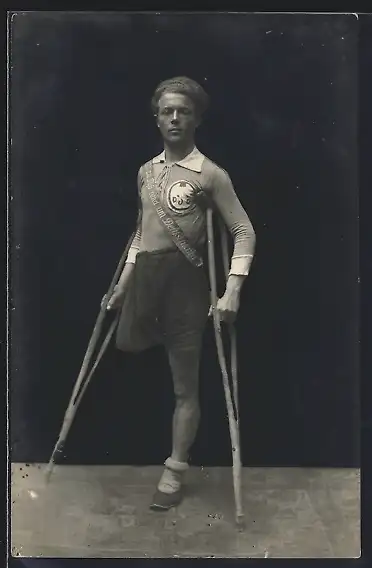 Foto-AK Junger Mann mit nur einem Bein auf Krücken