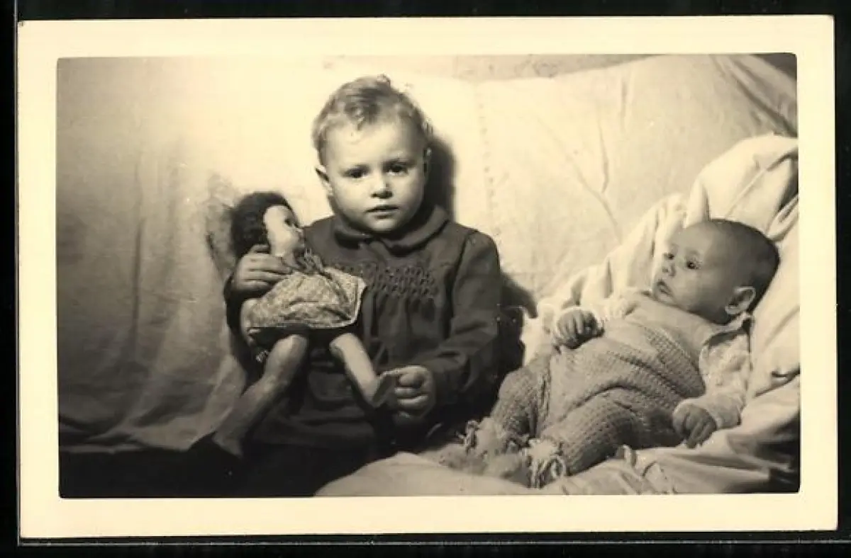 Foto-AK Kind mit seiner Puppe und einem Baby