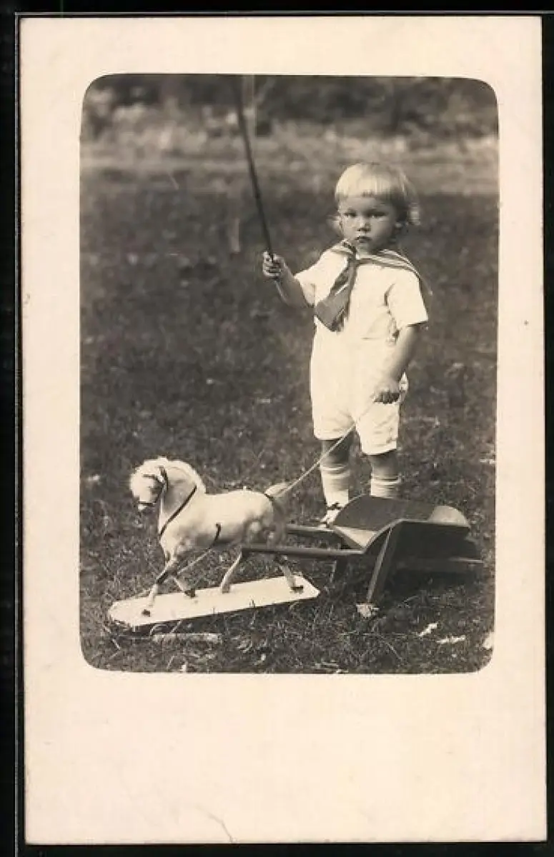 Foto-AK Kleiner Junge im Matrosenhemd mit Spielzeugpferd