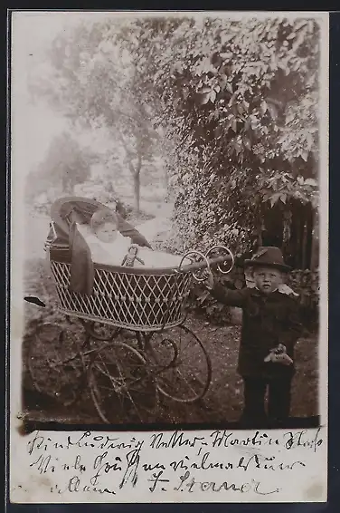 Foto-AK Kleiner Junge mit Kind im Kinderwagen in einer Parkanlage