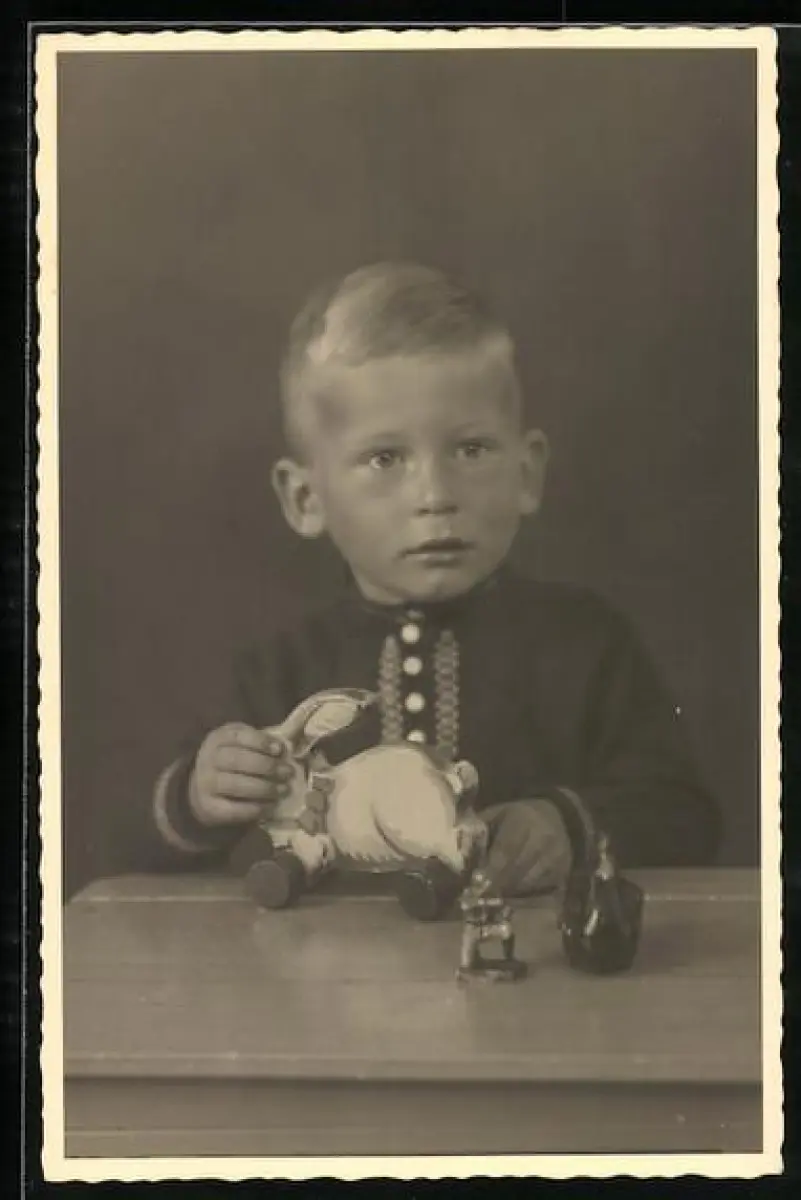 Foto-AK Kleiner Junge mit einem Spielzeughasen