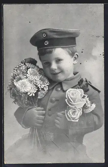 Foto-AK Kleiner Soldat in Uniform mit Blumenstrauss