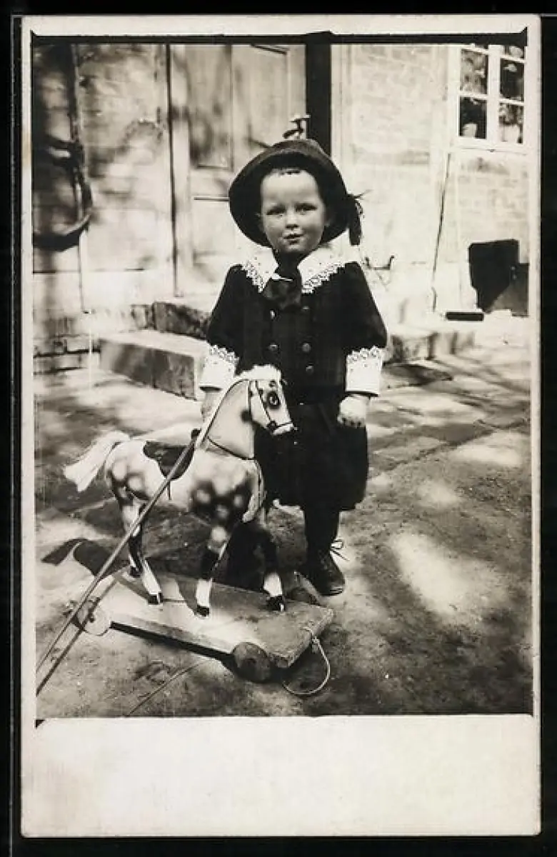 Foto-AK Kleines Kind mit Pferd auf Zugwagen, Schaukelpferd