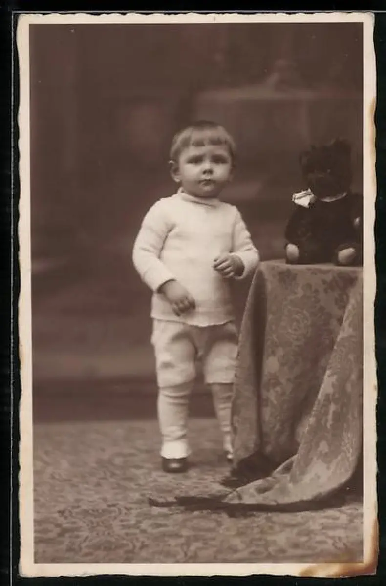 Foto-AK Kleines Kind neben Teddy auf einem Tisch