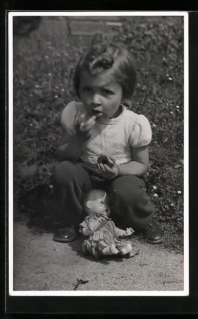 Foto-AK Kleines Mädchen mit Puppe und Butterbrot