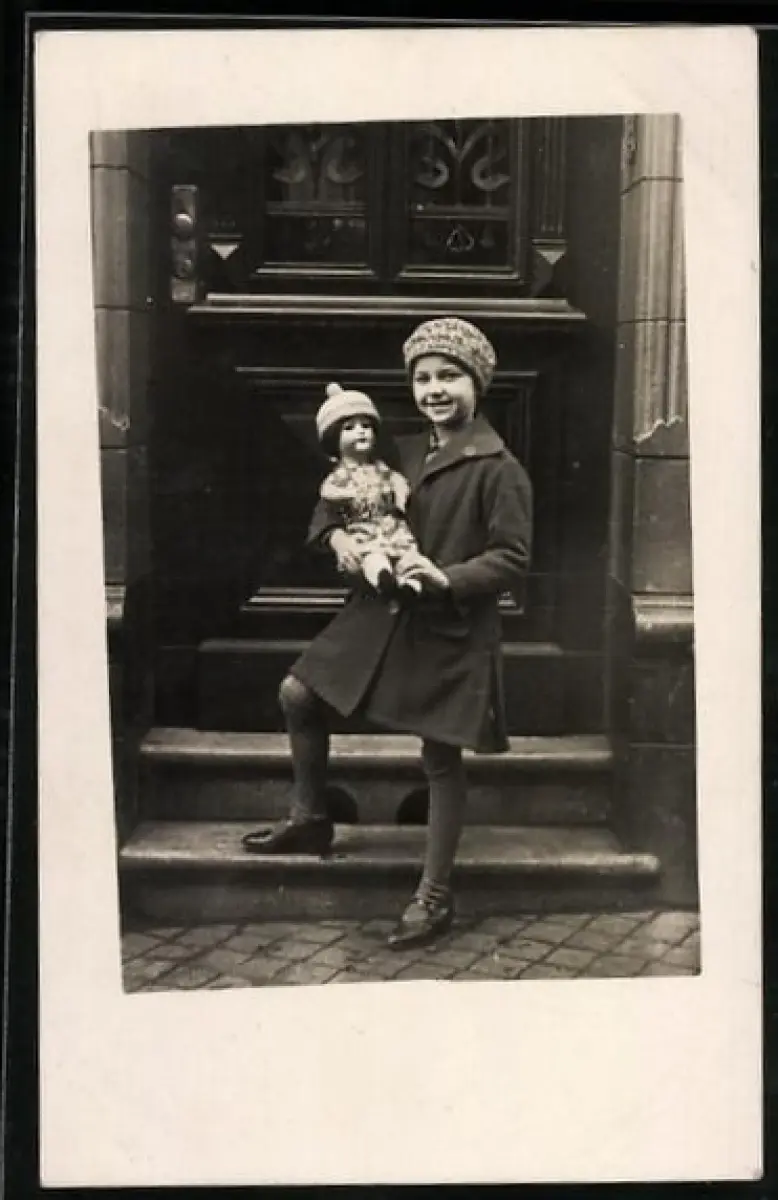 Foto-AK Kleines Mädchen mit Puppe vor einer Haustür
