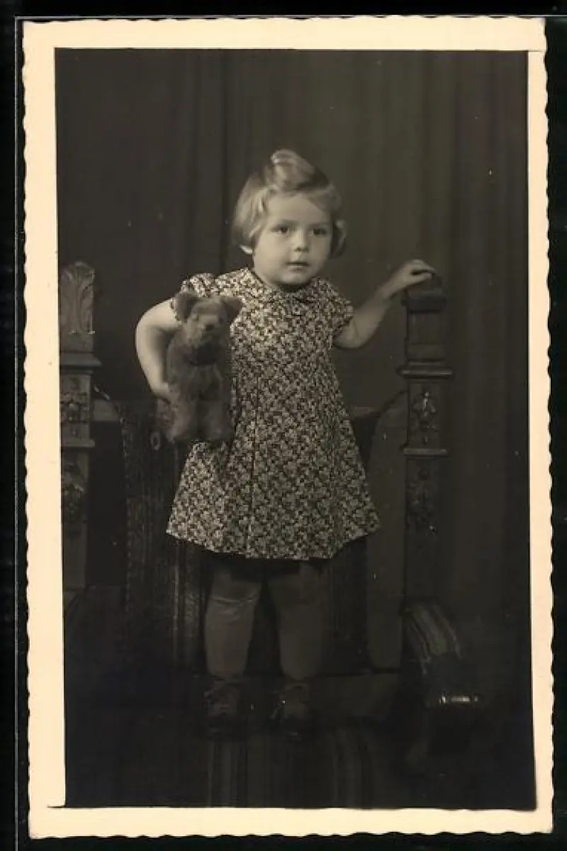 Foto-AK Kleines Mädchen mit Teddy unter dem Arm, 1942