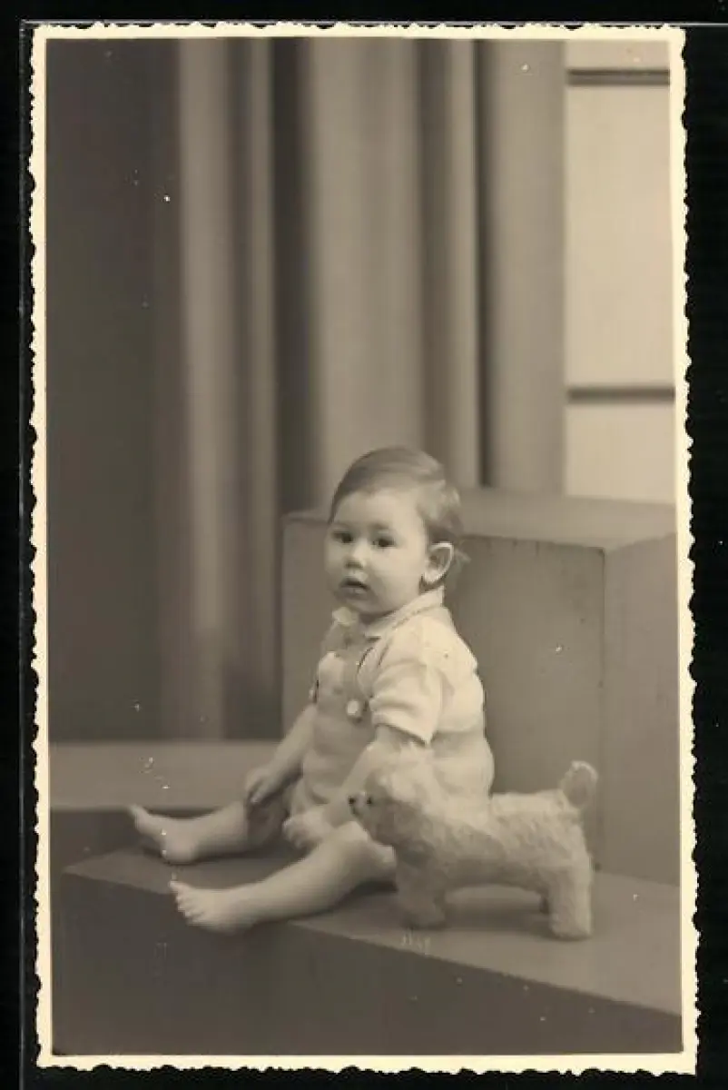 Foto-AK Kleinkind sitzt neben einem Plüschtier