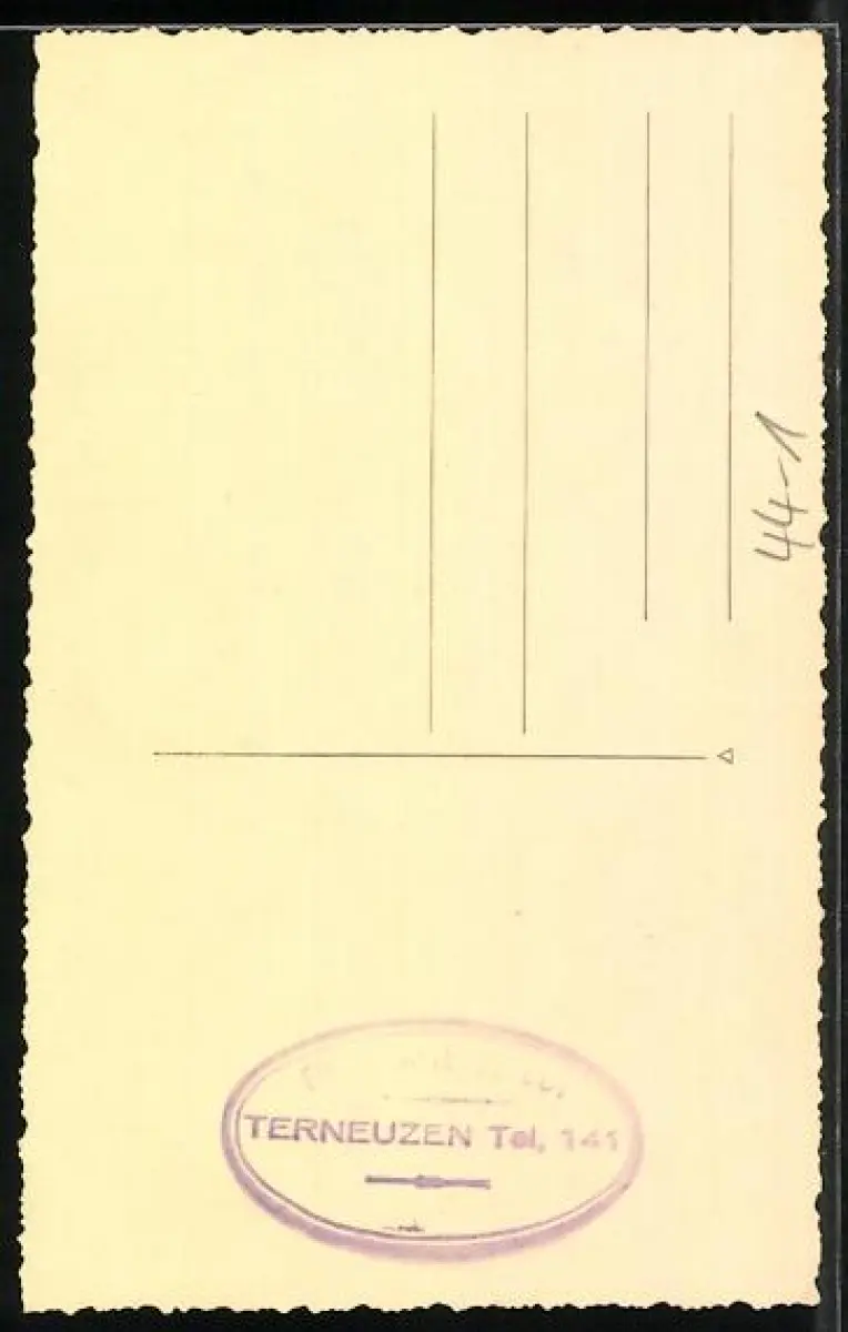 Personenbezogene Daten auf der Rückseite der Karte wurden durch blauen Textmarker unkenntlich gemacht. Die blauen Stellen sind auf die Vorderseite durchgeweicht und wirken sich negativ auf das Postkartenfoto aus