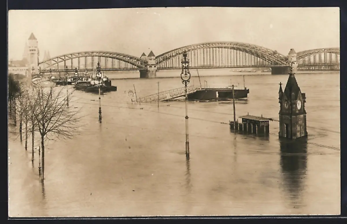 Foto-AK Köln, Am Rheinufer bei Hochwasser