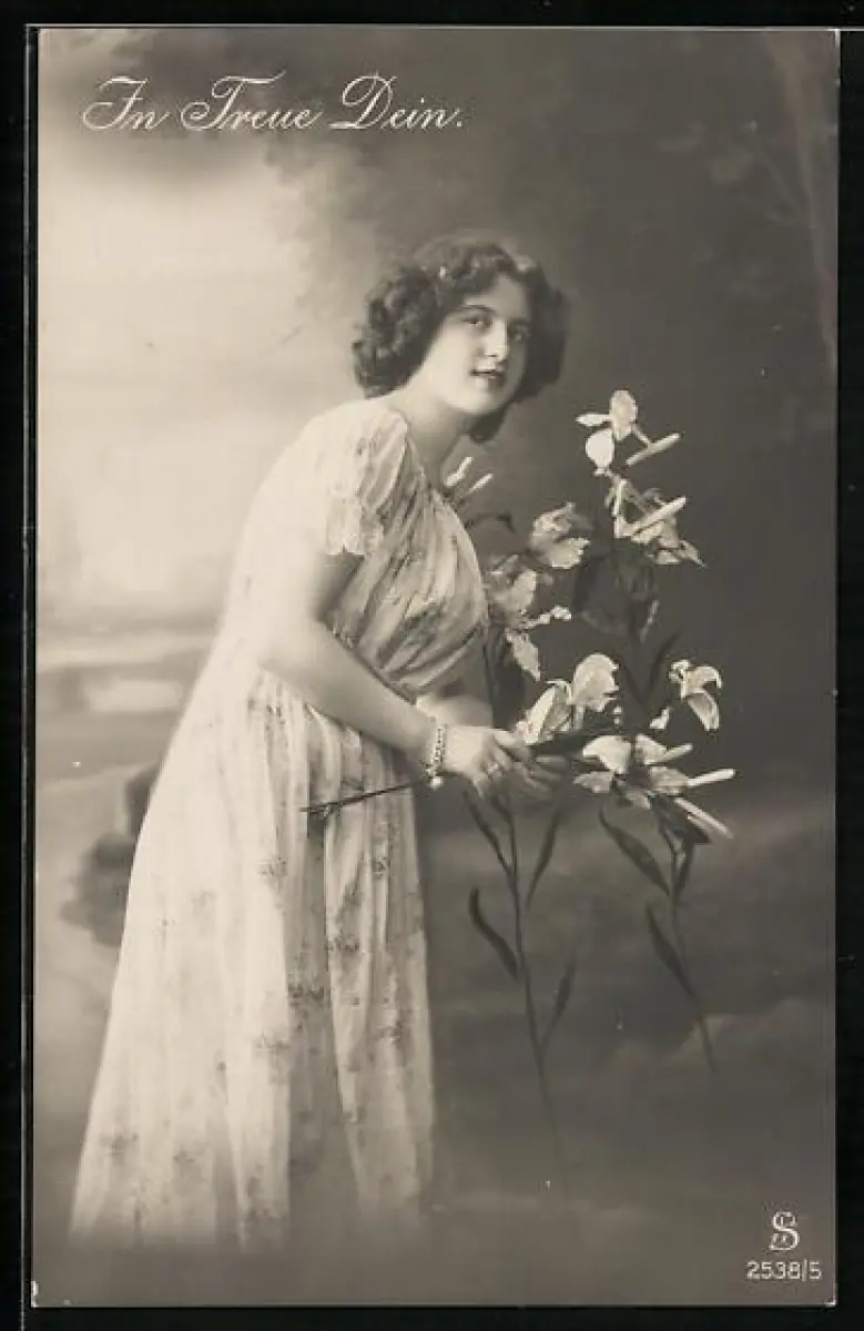 Foto-AK L.J. & F.F. Nr. 2538/5: Fräulein im Kleid mit Blumen