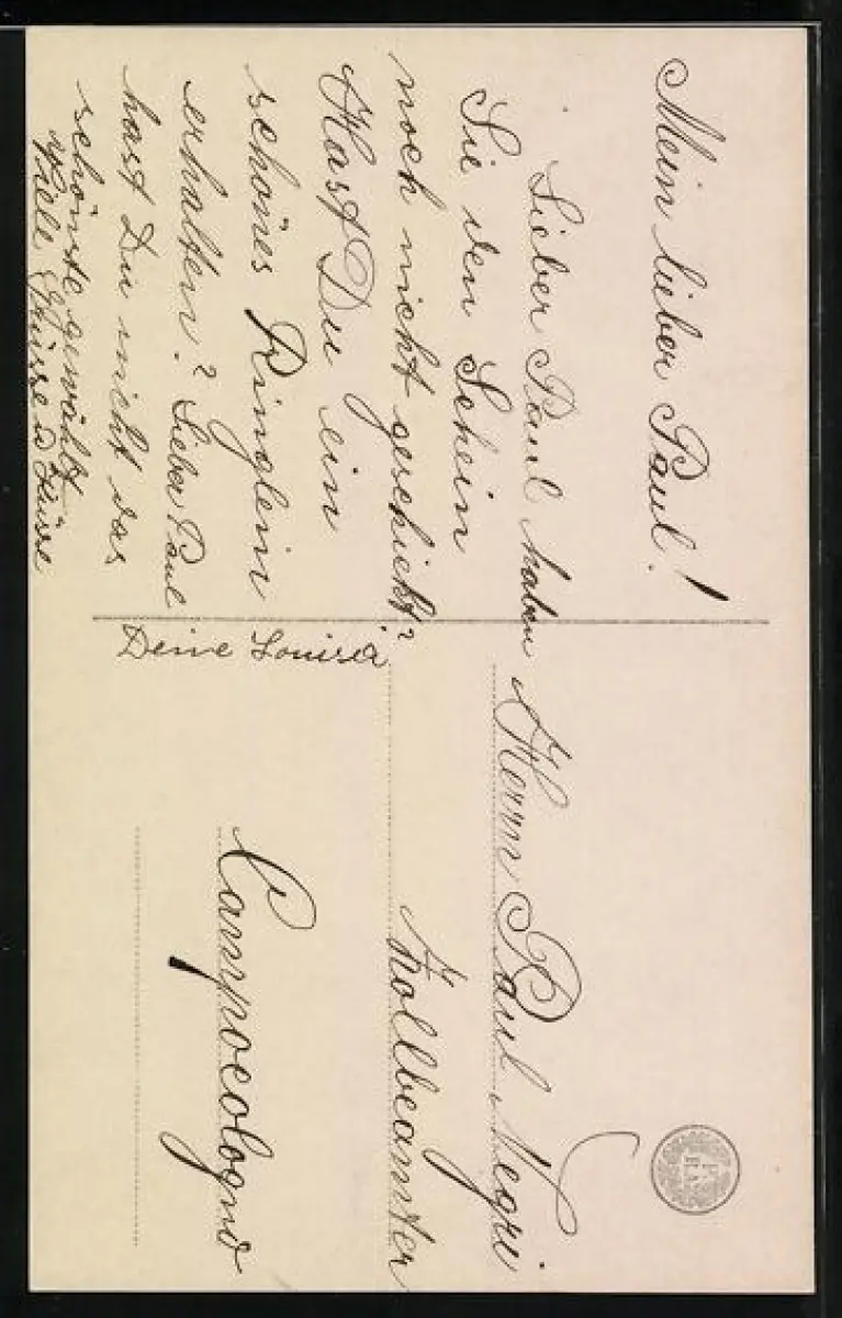 Personenbezogene Daten auf der Rückseite der Karte wurden durch blauen Textmarker unkenntlich gemacht. Die blauen Stellen sind auf die Vorderseite durchgeweicht und wirken sich negativ auf das Postkartenfoto aus