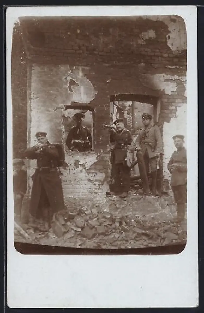 Foto-AK Labiau, Deutsche Soldaten in einem zerstörten Gebäude 1914
