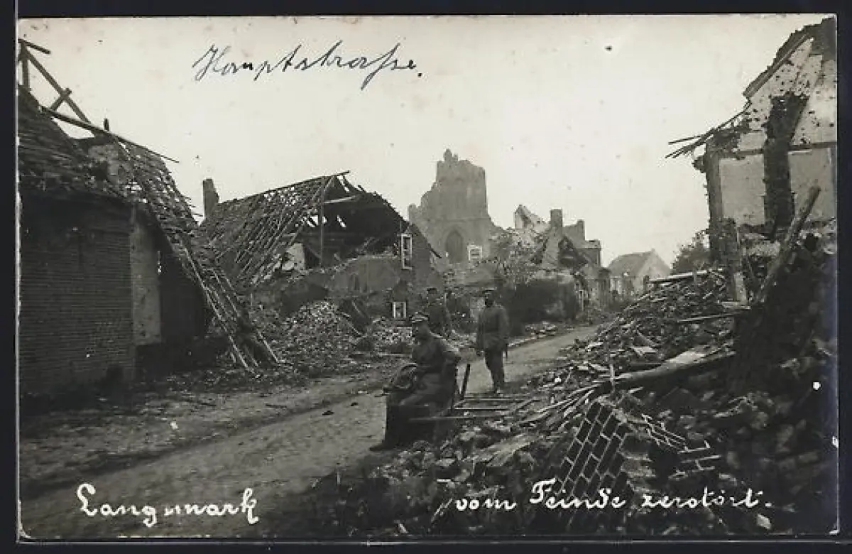 Foto-AK Langemark, Zerstörte Gebäude entlang der Hauptstrasse in Langemark