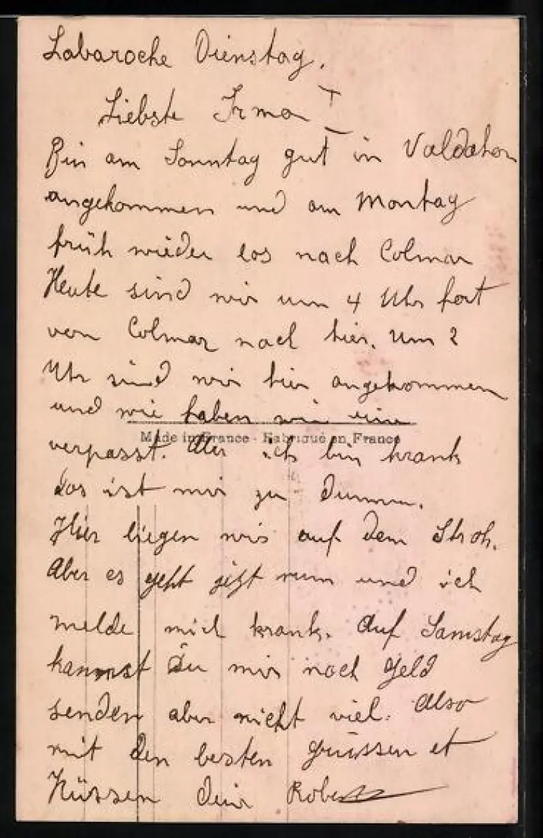 Personenbezogene Daten auf der Rückseite der Karte wurden durch blauen Textmarker unkenntlich gemacht. Die blauen Stellen sind auf die Vorderseite durchgeweicht und wirken sich negativ auf das Postkartenfoto aus