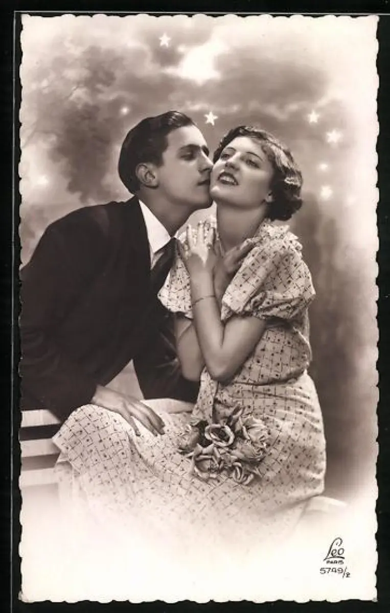 Foto-AK Leo, Paris Nr. 5749/2: Junger Mann küsst zärtlich junge Frau